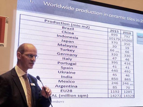 歐盟陶瓷協(xié)會(huì)秘書(shū)長(zhǎng)RENAUD BATIER先生宣布會(huì)議開(kāi)始并對(duì)國(guó)際瓷磚貿(mào)易、生產(chǎn)和消費(fèi)進(jìn)行解讀。