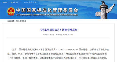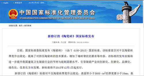 日前,國家質(zhì)量監(jiān)督檢驗檢疫總局、國家標準委批準發(fā)布中華人民共和國國家標準公告(2015年第15號),由我院負責起草的《陶瓷磚》(GB/T 4100-2015)和《節(jié)水型衛(wèi)生潔具》(GB/T 31436-2015)國家標準同時發(fā)布,將于2015年12月1日起正式實施。