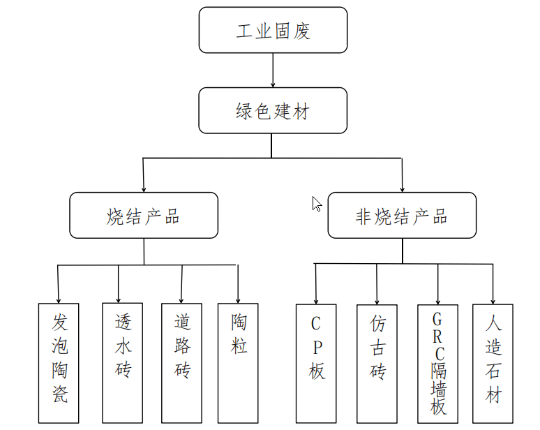以工業固廢為主要原料,添加少量的膠凝材料或硅質、石灰質材料進行化學反應,高壓或常壓養護制得的產品。產品有蒸壓灰砂磚、粉煤灰磚、人造石材、CP 板、道沿石、仿石材磚等。