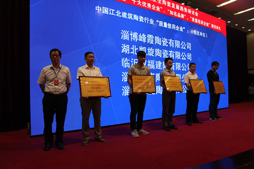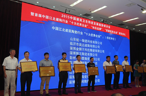 會(huì)上對(duì)2015首屆中國(guó)江北建筑陶瓷行業(yè)“十大優(yōu)秀企業(yè)”、“知名品牌”、“質(zhì)量信用企業(yè)”進(jìn)行了表彰和頒獎(jiǎng)。山東統(tǒng)一陶瓷科技有限公司、臨沂市奧達(dá)建陶有限公司等10家企業(yè)被評(píng)為2015首屆中國(guó)江北建筑陶瓷行業(yè)“十大優(yōu)秀企業(yè)”,“瓦倫蒂諾”、“米羅印象”等20個(gè)陶瓷品牌被評(píng)為2015首屆中國(guó)江北建筑陶瓷行業(yè)“知名品牌”,淄博獅王陶瓷有限公司、沈陽新王者陶瓷有限公司等20家企業(yè)被評(píng)為2015首屆中國(guó)江北建筑陶瓷行業(yè)“質(zhì)量信用企業(yè)”。